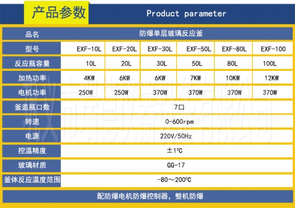 F-100L單層玻璃反應(yīng)釜參數(shù):