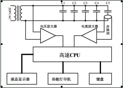 變壓器輸出30V或2V測試電壓,通過測試線連接到電容組的兩個(gè)匯流排上。匯流排電壓,又經(jīng)過測試線引入到儀器內(nèi)部的電壓檢測電路上。經(jīng)過A/D轉(zhuǎn)換器變?yōu)閿?shù)字信號(hào)后,通過隔離器件,將信號(hào)送到CPU。待測電容Cx的電流,經(jīng)過鉗型CT取樣和程控放大后,通過A/D轉(zhuǎn)換器變?yōu)閿?shù)字信號(hào),送到CPU。CPU將收到的數(shù)字信號(hào)進(jìn)行處理,并取得電壓U和電容電流Ic,然后按:Cx=Ic/ωU計(jì)算電容量,ω=2πf,f為頻率。