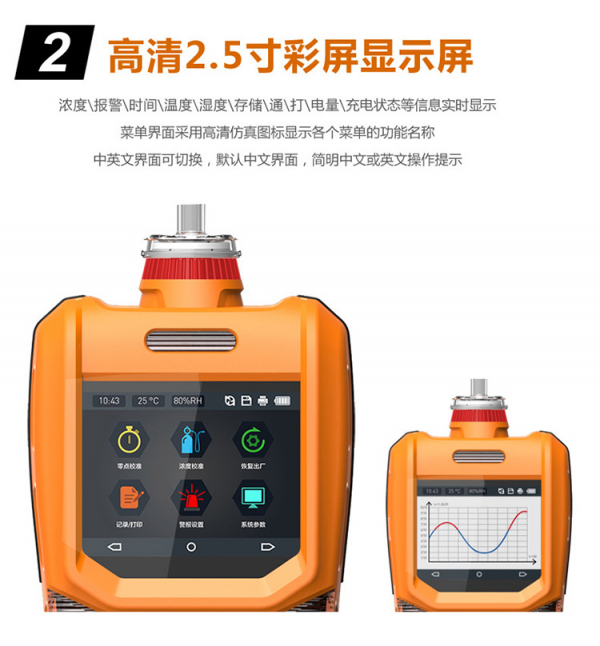 ●高清2.5寸彩屏顯示實時濃度、報警、時間、溫度、濕度、存儲、通信、打印、電量、充電狀態(tài)等信息,菜單界面采用高清仿真圖標顯示各個菜單的功能名稱