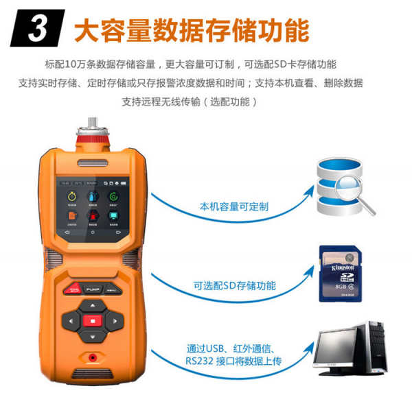 大容量可訂制。可選配SD卡存儲功能,支持實時存儲、定時存儲或只存報警濃度數(shù)據(jù)和時間、支持本機查看、刪除數(shù)據(jù),也可通過USB、紅外通信、RS232接口將數(shù)據(jù)上傳到電腦,用上位機軟件分析數(shù)據(jù)和存儲、打印。支持遠程無線傳輸(選配功能)