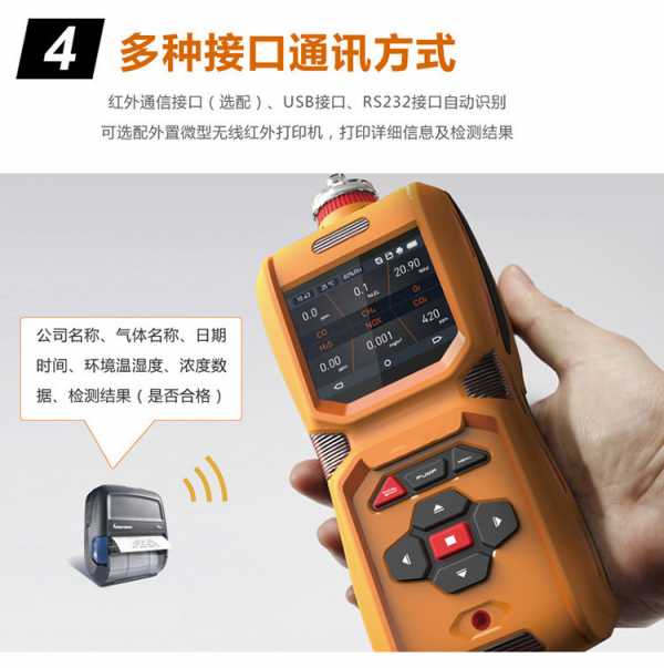 ●紅外通信接口(選配)、USB接口、RS232接口自動識別,可選配外置微型無線紅外打印機,打?。汗久Q、氣體名稱、日期時間、環(huán)境溫濕度、濃度數(shù)據(jù)、檢測結果(是否合格)