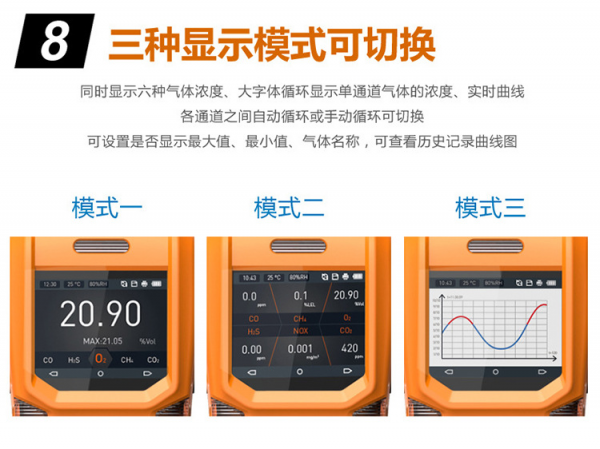 ●三種顯示模式可切換:同時顯示四種氣體濃度、大字體循環(huán)顯示單通道氣體的濃度、實時曲線,各通道之間自動循環(huán)或手動循環(huán)可切換,可設置是否顯示max值、min值、氣體名稱,可查看歷史記錄曲線圖。