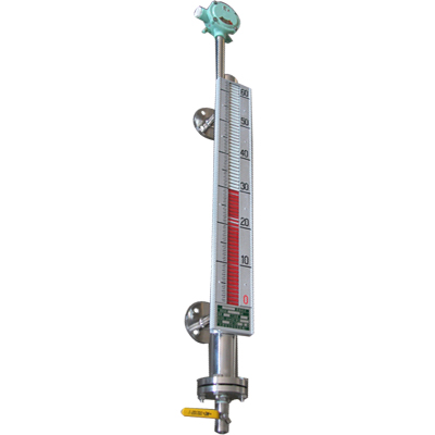 在磁性浮子液位計上安裝變送器。變送器由傳感器和轉(zhuǎn)換器兩部分組成,它通過磁浮子上下移動,經(jīng)磁耦合作用使導(dǎo)管內(nèi)測量元件依